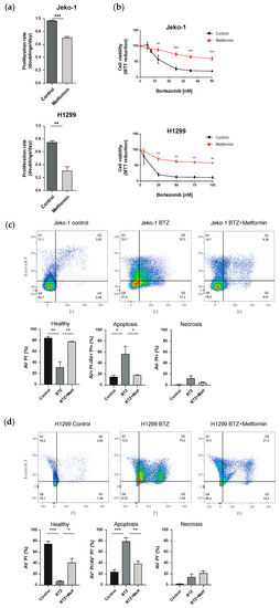 We first confirmed the antiproliferative effects of metformin in the two cancer cell lines. The proliferation rate of both Jeko-1 and H1299 cells was clearly reduced by treatment with 10 mM metformin for 72 h (Figure 1a). Next, we tested whether metformin treatment affects cell viability in response to proteasome inhibitor treatment. For that, cells were pre-treated with or without metformin for 48 h, exposed to increasing doses of Bortezomib (5–50 nM for Jeko-1 cells; 5–100 nM for H1299 cells) for 24 or 48 h, and cell viability was determined via MTT assays. We noticed that Jeko-1 cells were more sensitive toward Bortezomib-induced cell death compared to H1299 cells and therefore adjusted Bortezomib treatment time to 24 h. Of note, metformin reduced the sensitivity of both Jeko-1 and H1299 cells towards Bortezomib treatment and conferred resistance towards proteasome inhibition (Figure 1b). While Bortezomib reduced cell viability by about 80% in the mantle cell lymphoma cell line Jeko-1 at a dose of 35 nM, metformin pre-treated cells maintained 65% of cell survival even at the maximal dose of 50 nM Bortezomib. This effect was even more pronounced in the lung cancer cell line H1299 with a 90% reduction in cell survival with 25 nM Bortezomib but about 60% survival even at the highest dose of 100 nM Bortezomib without metformin pre-treatment. We confirmed this finding by quantifying cell death using flow-cytometry-based annexin V detection. Pre-treating Jeko-1 cells with metformin completely abrogated the induction of apoptosis induced by 20 nM Bortezomib and strongly reduced necrotic cell death (Figure 1c). Metformin similarly increased the resistance to Bortezomib-induced apoptotic cell death in H1299 cells (Figure 1d).