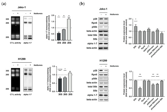 We next investigated the mechanism that may cause metformin-induced Bortezomib resistance. Based on our previous study, where we had demonstrated that metformin-induced metabolic remodeling impairs assembly and activity of 26S proteasome complexes by transcriptional regulation of assembly factors [17], we here analyzed 26S proteasome assembly in detail. The activity and amounts of different proteasome complexes were analyzed in native cell lysates by native gel electrophoresis followed by chymotrypsin-like (CT-L) substrate overlay assay and immunoblotting for 20S α1-7 subunits [19]. Metformin treatment of both Jeko-1 and H1299 cell lines significantly reduced the activity of singly capped 26S and doubly capped 30S complexes. In Jeko-1 cells, 20S activity was increased (Figure 2a). Immunoblotting of the native gels for 20S subunits revealed diminished amounts of 26S and 30S complexes in metformin-treated cells, while the amount of the 20S complexes was increased (Figure 2a). This indicates either disassembly of 26S complexes or impaired assembly of preexisting 20S with 19S regulators. To further investigate potential defects in the assembly of the 26S proteasome upon metformin treatment, we analyzed the expression of several 26S proteasome assembly factors, such as Rpn6, p28, and S5b, as well as components of the 20S proteasome by Western blotting. Of note, metformin treatment upregulated expression of only S5b in Jeko-1 cells, while the assembly chaperone p28 was significantly downregulated in H1299 cells (Figure 2b). Rpn6 expression was not altered. While S5b functions as an inhibitor, p28 acts as a chaperone of 26S proteasome assembly [20,21]. Accordingly, these data indicate that metformin treatment impairs the assembly of 26S proteasome complexes in Jeko-1 and H1299 cancer cells by differentially regulating assembly factors. Of note, expression data for Jeko-1 and H1299 cell lines obtained from publicly available GEO data sets indicate differential expression of proteasome assembly factors at baseline, with S5b being significantly lower expressed in Jeko-1 compared to H1299 cells (data not shown), which may add to the differential metformin-induced regulation of S5b and p28 in the two cell lines. We also analyzed the activation of the p70 ribosomal S6 kinase, a key enzyme involved in the activation of protein synthesis via the mTOR pathway [22], as we had previously observed that metabolic regulation of 26S activity involved specific regulation of proteasome assembly factors via the mTORC1 pathway [17]. While Jeko-1 cells did not show altered p70 S6 kinase activation, both, expression of the total and phosphorylated forms of p70 S6 kinase, were significantly reduced in H1299 cells (Figure 2b). These results further add to the notion that the two cancer cell lines of hematopoietic (Jeko-1) versus lung cell origin (H1299) use different mechanisms to regulate 26S proteasome activity upon metformin treatment.