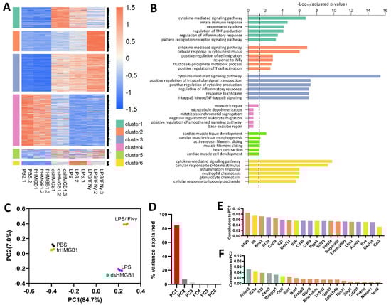 The PCA plot reveals the three separate clusters: frHMGB1 group clusters close to the PBS control group; dsHMGB1 and LPS groups are close to each other and separate from the PBS control and frHMGB1; the LPS/IFNγ group is approximately equally separated from the other two clusters (Figure 1C). PC1, accounting for more than 84%, is the main variance explaining the separation, and PC2 to PC6 are all below 10% (Figure 1D). The genes that are most accounted for in PC1 are located in clusters 2, 3, and 6 (Figure 1E), while the genes that are most accounted for in PC2 are located in clusters 1, 2, and 6 (Figure 1F); this corresponds to that of dsHMGB1, LPS, and LPS/IFNγ, as the pro-inflammatory groups, are most separated from the control in the PCA plot (Figure 1C).