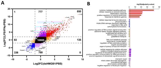 Comparison of common and distinct genes of LPS/IFNγ- and dsHMGB1-stimulated BMDMs. (A) Log2FoldChange (Log2FC) vs. Log2FC plot of dsHMGB1 vs. control on the x-axis and LPS/IFNγ vs. control on the y-axis highlighting common upregulated genes in red (850 genes), common downregulated genes in blue (336 genes), LPS/IFNγ up- and dsHMGB1 downregulated genes in dark yellow (1 gene), dsHMGB1-distinct genes in orange (218 genes) and LPS/IFNγ-distinct genes (1557 genes) in purple. Grey dotted lines represent a ±2 cut-off. (B) GO analysis on six gene sets, only the top five enriched biological processes are presented, sorted by adjusted p-value. The scatter line indicates the cut-off p-value 0.05.