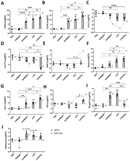 qPCR validation of the featured genes identified by RNA-Seq. Expression of Il12b (A), Cxcl9 (B), Cnr2 (C), Lrrc17 (D), Ikzf4 (E), Hamp (F), Ccr17 (G), Il33 (H), Rasgrf1 (I), Madcam1 (J) were determined using qPCR in BMDMs stimulated for 24 h by frHMGB1, dsHMGB1, LPS and LPS/IFNγ (M1), n = 4 mice, 2 replicates/mouse/condition. Gene expression is represented as Log2FoldChange (Log2FC) relative to the mean of the PBS group, and the scale bars represent the standard deviations (SD). Red dots represent the RNA-Seq results. Statistical comparisons were performed using RM-one way ANOVA with Turkey’s multiple comparisons test on data that are normally distributed or using Friedman test with Dunn’s multiple comparisons on data that are not normally distributed. # = significant comparing with PBS control; * = significant comparing between two treatment groups. */#, p < 0.05; **/##, p < 0.01; ***/###, p < 0.001; ****/####, p < 0.0001.