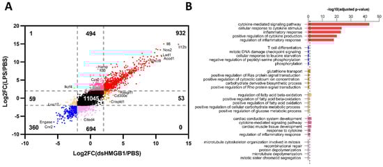 Comparison of common and distinct genes of LPS- and dsHMGB1-stimulated BMDMs. (A) Log2FoldChange (Log2FC) vs. Log2FC plot of dsHMGB1 vs. control on the x-axis and LPS vs. control on the y-axis highlighting common upregulated genes in red (932 genes), common downregulated genes in blue (360 genes), LPS up- and dsHMGB1 downregulated genes in dark yellow (1 gene), dsHMGB1-distinct genes in orange (112 genes) and M1-distinct genes (1188 genes) in pink. Grey dotted lines represent a ±2 cut-off. (B) GO analysis on six gene sets; only the top five enriched biological processes are presented, sorted by p-value. The scatter line indicates the cut-off p-value 0.05.