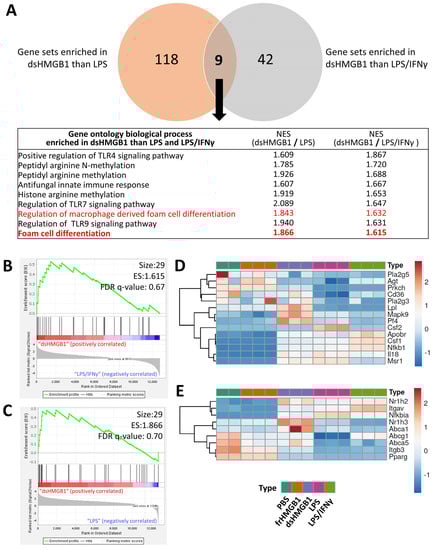 Foam cell differentiation-related gene sets were enriched by dsHMGB1 than LPS and LPS/IFNγ. (A) GSEA analysis revealed that 127 gene sets were enriched by dsHMGB1 than LPS, 51 gene sets were enriched by dsHMGB1 than LPS/IFNγ (NES cut-off = 1.6). Nine sets were commonly enriched, among which two were related to foam cell differentiation. (B) Foam cell differentiation was enriched by dsHMGB1 (left, red) comparing with LPS/IFNγ (right, blue). (C) Foam cell differentiation was enriched by dsHMGB1 (left, red) comparing with LPS (right, blue). (D,E) The genes included in positive (D) and negative (E) regulation of macrophage-derived foam cell differentiation (GO:0010744 and GO:0010745) were listed and heatmap which was created based on the normalized gene counts in each sample. Colour intensity was scaled within each row so that the highest value corresponds to red and the lowest to blue. Abbreviation: ES, enrichment score; NES, normalized enrichment score; FDR, False Discovery Rate.