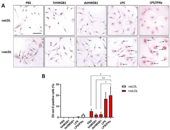 Effects of HMGB1 on foam cell formation from BMDMs. After incubation with frHMGB1 (5 µg/mL), dsHMGB1 (5 µg/mL), LPS (1 µg/mL) or LPS/IFNγ (100 ng/mL LPS and 20 ng/mL IFNγ) for 2 h, BMDMs were treated with oxLDL (100 μg/mL) for 24 h. (A) Oil red O staining in stimulated BMDMs. Scale bar = 10 μm. (B) The percentage of cells with lipid droplets stained using oil red O in BMDMs with and without oxLDL induction, normalized with haematoxylin counterstaining. Average was calculated from the three pictures taken from each cell culture well, n = 4 mice, mean of 4+SEM. Statistical comparisons were performed using two-way ANOVA with Šídák’s multiple comparisons, *, p < 0.05; **, p < 0.01.