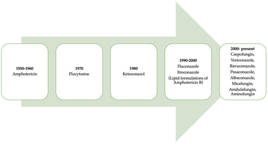 A retrospective look at the evolution of antifungals throughout history. Figure adapted from [7].