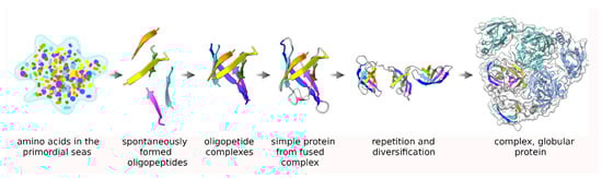 An illustration of Dayhoff’s hypothesis about the origin of proteins [9,17]. From left to right, starting from individual, spontaneously formed amino acids in the Archaean seas, short oligopeptides formed spontaneously which then organized into homogenous complexes and eventually fused into a single transcript module, probably after being encoded in the genome. Duplication and repetition of these modules along with drift in their sequence and function eventually gave rise to complex, globular proteins.