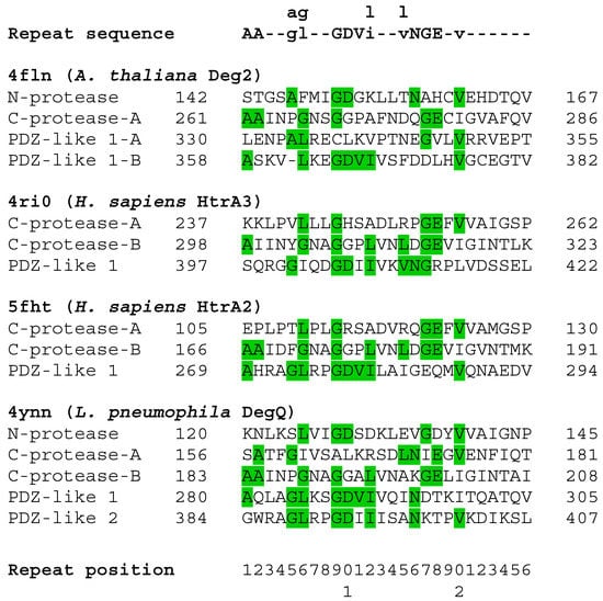 As previously reported, all known proteins (UniRef90 [35]) were examined for self-homology using a modified version of DOTTER [33,34]. This analysis found a number of proteins with significant self-homology that were in a protease Do-like cluster. HtrA proteases were then collected from the PDB [5]. Short sequences (less than 200 residues) were removed and the remainder were filtered at the 90% sequence identity threshold with CD-HIT [36], leaving 20 unique structures (i.e., 2zle, 2z9i, 3gdv, 3nzi, 3pv5, 3qo6, 4a9g, 4fln, 4ic5, 4ic6, 4ri0, 4ynn, 5fht, 5ilb, 5jyk, 5t69, 5zvj, 6jjo, 6z05, 7co3). The locations of probable sequence repeats were identified by reverse calculation of the DOTTER plots of these protein sequences where each residue was assigned its maximal self-homology score. The high scoring regions from all the proteins were separated and the frequency of each amino acid at each position was calculated; those positions which had strong biases towards a single, or a pair of similar, amino acids were noted. This process identified a 26-residue repeating sequence. Multiple sequence alignment of these repeats with MUSCLE [37] (Figure S1) helped to clarify the repeated sequence in which 13 of the 26 positions were conserved, specifically [AA(X2)[A/G][G/L](X2)GDV[I/L](X2)[V/L]NGE(X1)V(X6)], which can also be represented as AA--[A/G][G/L]--GDV[I/L]--[V/L]NGE-V------. This repeat was then used for further sequence searches.