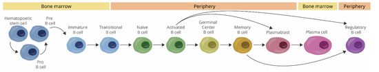 In brief, B cells develop from hematopoietic stem cells in the bone marrow, initially as pro-B cells and then pre-B cells. B cells undergo immunoglobulin gene rearrangement to become immature B cells and mature in the periphery. Mature naïve B cells will encounter an antigen during an immune response and will become activated. They will differentiate into short-lived plasma cells or germinal center B cells. The germinal centers are also the sites in which B cells undergo immunoglobulin class switch recombination. After engaging with an antigen in the germinal centers, B cells will proliferate and eventually differentiate into long-lived memory and/or plasma cells (Figure 2) [83,84].