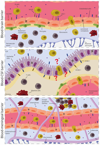 The importance of the route of entry across the BMB has also been demonstrated with CXCR7 inhibitor-treated EAE animals. This inhibitor reduced leukocyte trafficking from the leptomeningeal vessels into the SAS and decreased the extent of parenchymal leukocyte infiltrates [81]. Furthermore, VCAM-1 is expressed under normal conditions in the human meninges and its expression is increased in the meninges of MS patients [82]. Altogether, these results indicate that the BMB represents an essential structure regulating the entry of immune cells to the CNS and that the meningeal compartment plays an active role in neuroinflammatory diseases, such as MS.