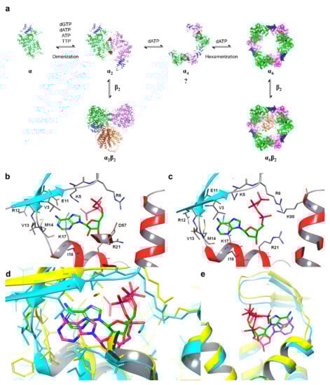 - Fairman, J.W.; Wijerathna, S.R.; Ahmad, M.F.; Xu, H.; Nakano, R.; Jha, S.; Prendergast, J.; Welin, R.M.; Flodin, S.; Roos, A.; et al. Structural basis for allosteric regulation of human ribonucleotide reductase by nucleotide-induced oligomerization. Nat. Struct. Mol. Biol. 2011, 18, 316–322. [Google Scholar] [CrossRef]