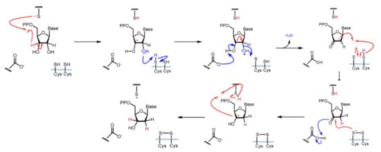 - Mao, S.S.; Holler, T.P.; Yu, G.X.; Bollinger, J.M., Jr.; Booker, S.; Johnston, M.I.; Stubbe, J. A model for the role of multiple cysteine residues involved in ribonucleotide reduction: Amazing and still confusing. Biochemistry 1992, 31, 9733–9743. [Google Scholar] [CrossRef] [PubMed]