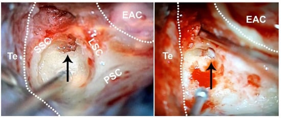 The adult bony labyrinth, right ear. Adult vestibular specimens were collected from the opened semicircular canals (black arrow, left panel) and after further drilling of the vestibulum (black arrow, right panel). EAC, external auditory canal. LSC, lateral semicircular canal. PSC, posterior semicircular canal. SCC, superior semicircular canal. Te, tegmen.
