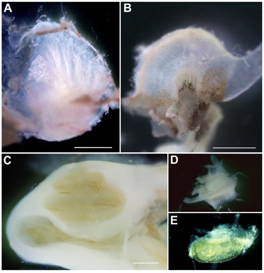 Human adult and fetal dissected inner ears. (A) Adult utricle. (B) Adult ampulla. (C) Fetal cochlea, W14. (D) The otic capsule was removed to expose the modiolus and organ of Corti. (E) Fetal saccule, W14. Scale bars: 1 mm.