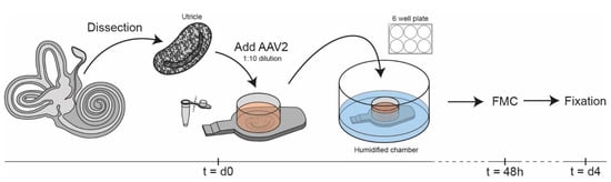 Samples were transferred under sterile conditions to the flat caps of PCR tubes holding a volume of 18 µL of medium (Figure 3). The caps were placed in a humidified well chamber to prevent evaporation. The viral construct was added to the medium (1:10 volume) for a total viral dose of 3.5 × 1012 gc, an order of magnitude greater than what has been used for non-human primates []. Samples were incubated at 37 °C. After 48 h, a full medium change was carried out by removing the caps and culturing the samples in 4 mL of fresh medium added to the six-well plate. On day 4, tissue culture was terminated and samples were fixed overnight in 4% formaldehyde (prepared from paraformaldehyde) in 0.1 M sodium/potassium phosphate buffer (pH 7.4) at 4 °C (Figure 3). Samples were kept at 4 °C and shielded from light until further processing. All samples were decalcified overnight in 10% EDTA.2Na (Sigma-Aldrich, St. Louis, MO, USA) in distilled water (pH 7.4) at 4 °C to dissolve any remaining osseous debris and/or otoconia.