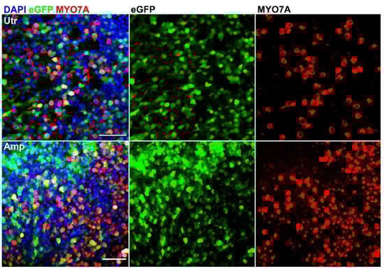 Details of transduced adult utricle (Utr) and ampulla (Amp), immunostained with anti-MYO7A antibodies. Cell counts were carried out on data from 2 ampullas and 3 utricles. Scale bars apply to all images in each row: 50 µm.