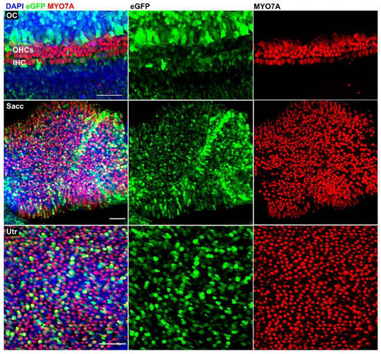 Details of transduced fetal organ of Corti (OC) showing inner and outer hair cells, respectively (IHC, OHC), and a fetal saccule (Sacc) and utricle (Utr), immunostained with anti-MYO7A antibodies. Fetal age = 14 weeks. Scale bars apply to all images in each row: 50 µm.