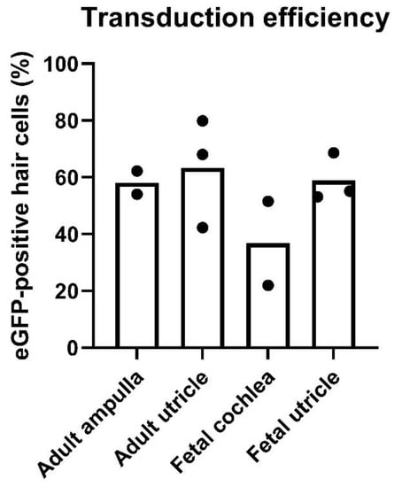 Transduction efficiency. The percentage of eGFP-positive hair cells was quantified by three blinded investigators. Cell counts on adult specimens were carried out on data from two ampullas and three utricles. Cell counts on fetal specimens were carried out on data from two cochleas and three utricles. Each black dot represents the mean of three individual cell counts. Bars represent the mean for each end organ, as indicated on the x-axis. eGFP-positive hair cells (%): adult ampulla, 58%; adult utricle, 63%; fetal cochlea, 37%; fetal utricle, 59%.