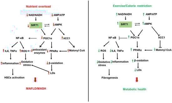 Role of sirtuin (SIRT) 1 in NAFLD. Left panel: Reduced SIRT1 with nutrient overload leads to the acetylation and inactivation of the peroxisome proliferator-activated receptor (PPAR) gamma-coactivator α (PGC1α). Reduced PGC1α activity downregulates β-oxidation by reducing PPARα expression and decreasing mitochondrial biogenesis, leading to increased lipid accumulation in LDs and hepatic steatosis. In addition, reduced SIRT1 activity decreases the expression of the antioxidant enzymes (SOD2 and catalase), leading to increased cellular ROS. On the other hand, reduced PGC1α activity increases the expression of the transcription factor NF-κB to increase inflammatory cytokines such as TNFα and IL6 and ROS generation. In addition, reduced AMP/ATP ratio with nutrient overload inactivates AMP-activated protein kinase (AMPK), leading to reduced NAD/ATP ratio and reduced SIRT1 and PGC1α activities. AMPK also directly regulates PGC1 via modulation of its phosphorylation. Reduced AMPK also reduces ACC1 phosphorylation and increases its activity leading to increased malonyl CoA and inhibition of β-oxidation. Right panel: Upregulation of SIRT1 by exercise, calorie restriction, and fasting upregulates SIRT1 leading to a healthier liver via opposite effects on B-oxidation, inflammation, and ROS generation than chronic nutrient overload.