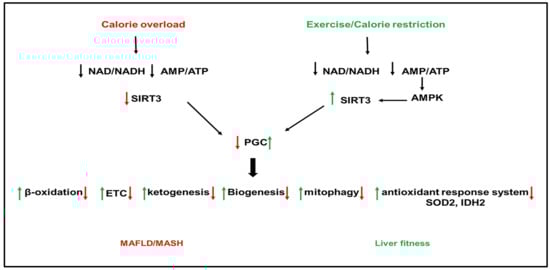 Role of sirtuins (SIRT) 3 in NAFLD. Calorie overload and liver lipotoxicity downregulate SIRT3 activity leading to the inactivation of PGC1α. The inactivation of PGC1α downregulates the downstream pathways, including β-oxidation, antioxidant enzymes (superoxide dismutase (SOD)2 and isocitrate dehydrogenase (IDAH)2, the ETC, ketogenesis, biogenesis, and mitophagy, leading to the development of hepatic steatosis, inflammation, and fibrogenesis. Activation of SIRT3 by exercise and calorie restriction activates PGC1α with opposite effects on PGC1 downstream pathways than nutrient overload and lipotoxicity, leading to metabolic health.