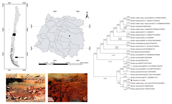 Map image showing the location of the Campanario hot spring located in the Andean Mountains in the Maule region, Chile, and photographs of the study site. On the right, the maximum likelihood phylogeny of isolate CamB6 (filled red circle) shows similarity with B. haynesii (outlined red circle).