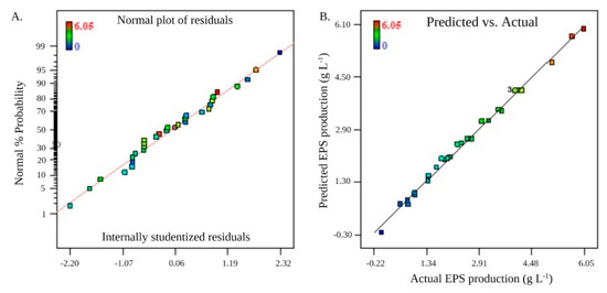 In addition to ANOVA and the correlation optimization model, regression analysis was applied to evaluate the best-fit line among the experiments that can be visualized by the normal plot of the residuals (Figure 2A). The observed experimental values plotted against predicted output values for EPS production are shown in Figure 2B and exhibit good aggregation between the observed and predictive values estimated by the quadratic optimization model.