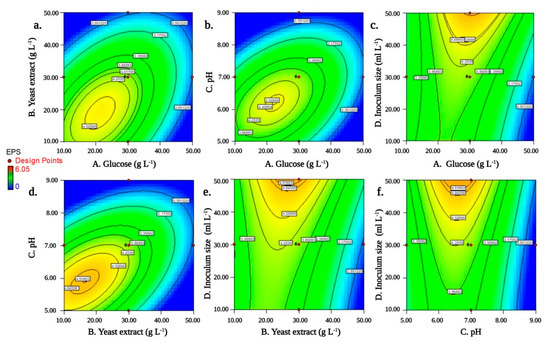 Contour plots (2-D) are a graphical representation that help to visualize the actual state of the regression optimization model to infer the relationship between parameters and response. Circular or elliptical curves indicate that corresponding parameters have not interacted, while hyperbolic and plateau-shaped curves denote interaction. In this study, the relationship between independent parameters and EPS production was explained by a 2-D contour plot of the response surface, while keeping others at zero level (coded value) [28]. In Figure 3a, it can be observed that the maximum yield of EPS was 4.6 g L−1 when the concentration of glucose and yeast extract were both 20 g L−1, while the minimum EPS yield was 0.1 g L−1 with high glucose and yeast extract concentrations (50 g L−1). Figure 3b illustrates glucose interaction with pH on EPS production, displaying a maximum EPS production of 4.5 g L−1 (glucose 20 g L−1, pH 6.0), with the minimum yield being produced when the glucose concentration and pH value increased. From Figure 3c, it can be seen that EPS production becomes highly affected by an increase in the glucose concentration to 50 g L−1 with an inoculum size of 10–30 mL L−1. Figure 3d explains the interaction between yeast extract and pH, and reveals a high EPS production (4.8 g L−1) when the pH was 6.0 and the yeast extract was 20 g L−1. A low yield was observed at a high yeast extract concentration and an alkaline pH. Interestingly, the interaction of the nitrogen source with inoculum size in Figure 3e demonstrates the same nature as that observed in Figure 3c between the carbon source and the inoculum size. Finally, Figure 3f displays the interaction between pH and inoculum size on EPS yield, where yield increased with a slightly acidic pH 6.0 and an inoculum size of 50 ml L−1.