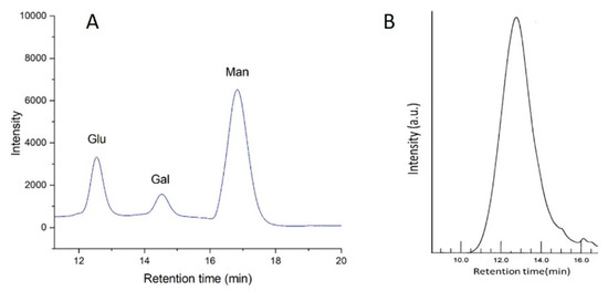 In Figure 5B the GPC chromatogram of CamB6 EPS is presented and shows a broad bell-shaped peak. From this GPC analysis, it is confirmed that the EPS produced by B. haynesii CamB6 has an average molecular weight (Mw) of 53.6 kDa.