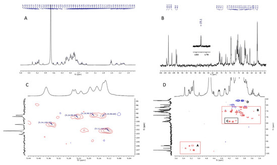 NMR analyses were performed at 60 °C after samples had been dissolved in D2O. Chemical shifts of water-soluble samples are expressed in d ppm relative to DSS as an internal reference for 13C and 1H signals, respectively. 1D (1H and 13C) and 2D NMR spectra (1H (obsd.) 13C, COSY, HSQC) were obtained by following the Bruker manual. 1H NMR and 13C NMR spectra were recorded at 400 and 100 MHz. Chemical shifts (δ) are reported in parts per million (ppm) relative to the residual solvent signals. (Supplementary Figure S1B,C).