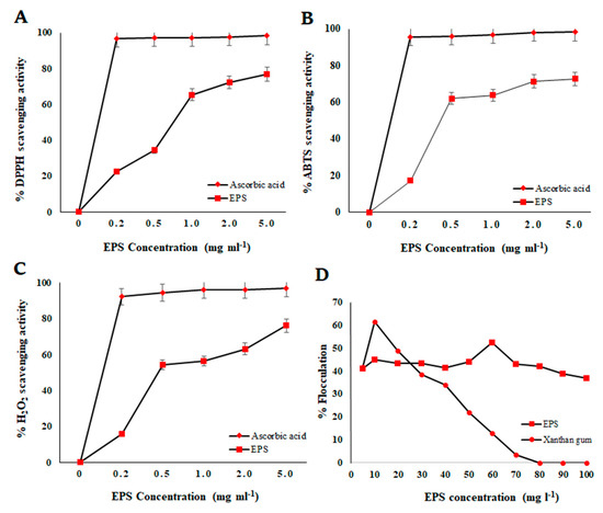 where A0 is the absorbance value of DPPH solution without the sample and A1 is the absorbance value of the EPS solution. Ascorbic acid was used as the positive control.