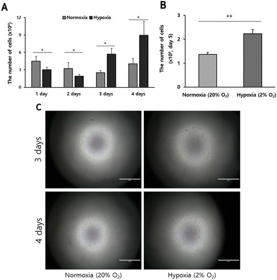 ) in a 96-well plate. (B) is the number of Hanwoo myoblasts cultured for 5 days in T25 flask under hypoxia or normoxia. (C) is representative images of the Hanwoo myosatellite cells cultured for 3 and 4 days under hypoxia or normoxia of (A) results. The Hanwoo myosatellite cells were proliferated by culturing them in growth medium. Each sample was repeated 3 times with triplicate and values are mean ± standard deviation. Asterisk means significant difference (* p < 0.05, ** p < 0.01). Scale bar: 1000 μm.