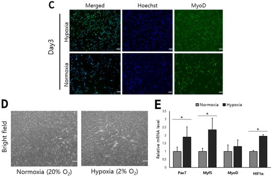 Immunofluorescence staining was carried out to analyze the distribution of cell nuclei, and expression of Pax7 and MyoD protein in Hanwoo myosatellite cells cultured in both oxygen concentrations. Hanwoo myosatellite cells were cultured for 1 day and 3 days under hypoxic (2% O2) and normoxic (20% O2) conditions. On the first day of culture, the Hoechst-positive nucleus and MyoD expression areas of Hanwoo myosatellite cells appear to be similar in hypoxia and normoxia (Figure 4A). On the third day of culture, it was confirmed that Hanwoo myosatellite cells were proliferating through the expression of nuclei, Pax7, and MyoD (Figure 4B,C). All cells of Hoechst-positive nuclei contain Pax7 and MyoD protein expression. The proliferation levels of Hanwoo myosatellite cells were measured through the relative levels of Pax7, Myf5, MyoD and HIF1α mRNA. Pax7 is a self-renewing protein of myosatellite cell and Myf5 is a myogenesis regulatory protein. MyoD is involved in the activation and differentiation of muscle cells. It is also important to consider that hypoxia-inducible factor-1α (HIF-1α) signaling pathway is regarded as a key signaling pathway involved in hypoxia-induced responses. Many studies suggest that HIF-1α upregulates the downstream target genes involved in cell proliferation and differentiation. HIF-1α also induces transcription of genes involved in cell proliferation and survival [34]. When cultured in both conditions for 6 days, the Hanwoo myosatellite cells became confluent (Figure 4D). In hypoxia, the Pax7 and HIF1α mRNA level was about twice as high, and the Myf5 mRNA level was more than twice as high as in normoxia (p < 0.05, Figure 4E). There is no significant difference in the mRNA level of MyoD.