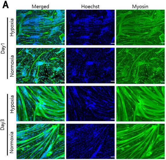 Differentiation of Hanwoo myoblasts were cultured for 1 and 3 days under hypoxia (2% O2) or normoxia (20% O2). (A): The Hanwoo myoblasts were cultured in DM under hypoxia or normoxia for 1 and 3 days. The cell nuclei stained with Hoechst (Hoechst 33,342 nucleic acid stain) were blue fluorescence and myosin proteins in myotubes were stained with green fluorescence. (B): On days 1 and 3 of differentiation culture in DM under hypoxia (