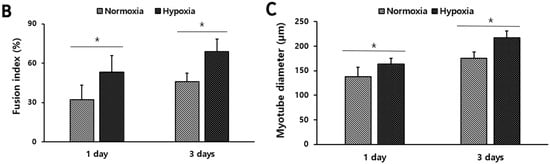 To investigate how both oxygen concentrations affected the differentiation of Hanwoo myosatellite cells, the confluent cells were cultured under hypoxia or normoxia in DM for 1 and 3 days. After cell culture in DM for 1 and 3 days, myotube formation was investigated by immunofluorescence of myosin protein. In both cell culture conditions, differentiation resulted in the fusion of myosatellite cells to form multinuclear myotubes. Myosin protein expression was higher in hypoxia compared to normoxia and promoted more myotube formation under hypoxic conditions (Figure 6A). To determine the degree of muscularization in both oxygen environments, the fusion index and the myotube diameter were investigated in myocytes cultured in DM for 1 and 3 days. The fusion index was higher in hypoxia (50%) than in normoxia (30%) on day 1 and higher in hypoxia (70%) than in normoxia (45%) on day 3 of cell culture in DM (p < 0.05, Figure 6B). The myotube diameters increased in both oxygen conditions, but their diameters in hypoxia were greater than those in normoxia on both days 1 and 3 of cell culture in DM (p < 0.05, Figure 6C). The differentiation of Hanwoo myocytes into myotubes was stimulated more under hypoxic conditions than under normoxic conditions.