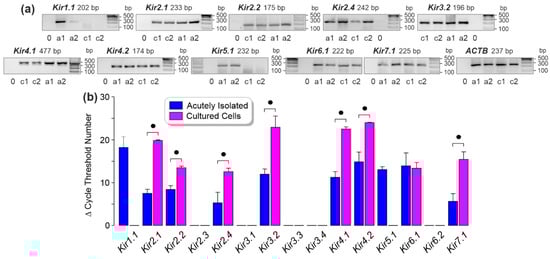 RT-PCR analysis was carried out to compare the expression of diverse Kir channel genes in RPE cells which were acutely isolated from eyes of post-mortem human donors (differentiated cells) and cultured RPE cells (dedifferentiated cells). Both acutely isolated and cultured cells contained transcripts of the following Kir channel genes: Kir2.1, Kir2.2, Kir2.4, Kir3.2, Kir4.1, Kir4.2, Kir6.1, and Kir7.1 (Figure 1a). Transcripts of Kir1.1 and Kir5.1 genes were detected in acutely isolated, but not in cultured cells (Figure 1a). The levels of the following Kir channel transcripts were below the detection threshold in both acutely isolated and cultured cells: Kir2.3, Kir3.1, Kir3.3, Kir3.4, and Kir6.2 (not shown). The levels of Kir2.1, Kir2.2, Kir2.4, Kir3.2, Kir4.1, Kir4.2, and Kir7.1 transcripts were smaller in cultured than acutely isolated cells, as shown by the significantly (p < 0.05) higher cycle numbers required to detect the transcripts in cultured cells (Figure 1b). The cycle numbers necessary to detect Kir6.1 transcripts were not significantly (p > 0.05) different between acutely isolated and cultured cells (Figure 1b). The mRNA expression levels are shown in the Supplemental Figure S1.