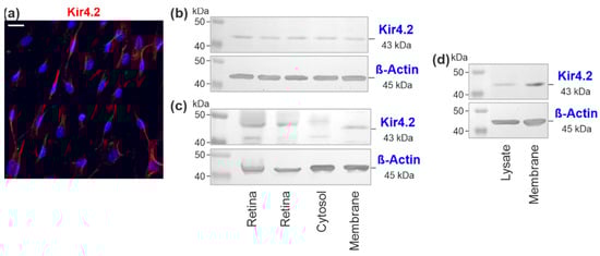 Kir4.2 protein in cultured human RPE cells. (a) Immunolabeling of a cell culture with an anti-Kir4.2 antibody (red). Cell nuclei were stained with DAPI (blue). Bar, 20 µm. (b) Western blot analysis of Kir4.2 protein performed with lysates of cells from five donors. (c) Western blots of Kir4.2 protein performed with lysates of acutely isolated neuroretinas from two post-mortem donors (left side) and cytosolic and membrane protein extracts of cells from one donor (right side). (d) Western blot of Kir4.2 protein performed with lysate and membrane protein extract of cells from one donor. (a,c,d) The images show one example of three experiments carried out using cells of different donors. The following antibodies were used for western blotting: rabbit anti-human Kir4.2 (c) and mouse anti-human Kir4.2 (b,d).