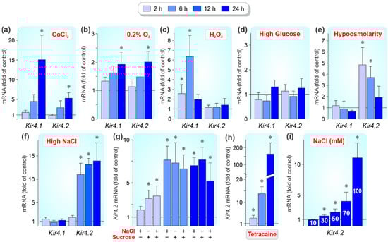 Regulation of Kir4.1 and Kir4.2 gene expression in cultured RPE cells by pathogenic conditions. Real-time RT-PCR was carried out with RNA extracted from cells which were stimulated 2, 6, and 24 h. In (f), a 12-h stimulation was also examined on Kir4.2 gene expression. Relative mRNA levels are shown as folds of unstimulated control (1). (a) Effects of chemical hypoxia, induced by adding 150 µM CoCl2, on the Kir channel gene expression. (b) Effect of cell culture in a 0.2% O2-atmosphere. (c–f) Effects of oxidative stress (20 µM H2O2; (c)), hyperglycemia (25 mM glucose; (d)), extracellular hypoosmolarity (60% osmolarity; (e)), and hyperosmolarity (+100 mM NaCl; (f)). (g) Effects of hyperosmotic media prepared by adding 100 mM NaCl or 200 mM sucrose, or by coaddition of NaCl and sucrose, on the Kir4.2 gene expression. (h) Effect of tetracaine (1 mM) on the Kir4.2 mRNA level. (i) Dose-dependent effect of high NaCl on the Kir4.2 mRNA level. Different concentrations (10–100 mM) of NaCl were added to the culture media. Each bar shows data derived from 3–9 independent experiments with cells of different donors. Significant difference vs. unstimulated control: * p < 0.05.