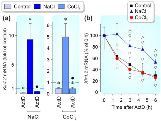 Kir4.2 gene transcription and mRNA stability. The hyperosmotic and CoCl2-induced expression of the Kir4.2 gene in cultured RPE cells is mediated by stimulation of gene transcription; extracellular hyperosmolarity also induces an increase of Kir4.2 mRNA stability. The relative mRNA level is shown as fold of unstimulated control (1; (a)) and percent of the 0-h control (b). (a) The NaCl- and CoCl2-induced Kir4.2 gene expression was prevented by actinomycin D (ActD; 5 µg/mL) which blocks RNA polymerase II. The cells were cultured 12 h in the absence and presence of high (+100 mM) NaCl and 24 h in the absence and presence of CoCl2 (150 µM), respectively. (b) The stability of the Kir4.2 mRNA differed significantly (p < 0.05; ∆) between cells cultured in the presence of high NaCl compared to cells cultured under control conditions and stimulated by CoCl2, respectively. The cells were first stimulated for 12 h with high (+100 mM) NaCl, and 24 h with CoCl2 (150 µM), respectively. Thereafter, actinomycin D (5 µg/mL) was added, and total RNA was isolated at different times. Each bar represents data obtained in 3–7 independent experiments using cells of different donors. Significant difference vs. unstimulated control: * p < 0.05. Significant difference vs. NaCl and CoCl2 control, respectively: ● p < 0.05. Significant difference vs. 0-h control: ○ p < 0.05.