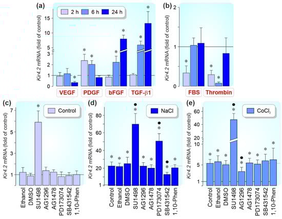 Effects of growth and blood factors on the Kir4.2 gene expression in cultured RPE cells. (a,b). Real-time RT-PCR was performed with total RNA extracted from cells which were stimulated 2, 6, and 24 h. The relative mRNA level is shown as fold of unstimulated control (1). (a) Effects of exogenous VEGF, PDGF, bFGF, and TGF-β1 (each at 10 ng/mL) on the Kir4.2 transcript level in cells cultured under control conditions. (b) Effects of fetal bovine serum (FBS; 10%) and thrombin (10 U/mL) under control conditions. (c–e) Effects of receptor blockers on the Kir4.2 gene expression in cells cultured 24 h in the absence (c) and presence of high (+100 mM) NaCl (d) and CoCl2 (150 µM; (e)), respectively. The following compounds were applied: the inhibitor of the VEGF receptor-2, SU1498 (10 µM), the blocker of the PDGF receptor tyrosine kinase, AG1296 (10 µM), the EGF receptor tyrosine kinase inhibitor AG1478 (600 nM), the inhibitor of the FGF receptor kinase, PD173074 (500 nM), the blocker of TGF-β1 superfamily activin receptor-like kinase receptors, SB431542 (10 µM), and the broad-spectrum metalloproteinase inhibitor 1,10-phenanthroline (1,10-Phen; 10 µM). The effects of ethanol (1:100) and dimethylsulfoxide (DMSO; 1:500) are shown as vehicle controls. Each bar represents data obtained in 3–8 independent experiments using cells of different donors. Significant difference vs. unstimulated control: * p < 0.05. Significant difference vs. NaCl and CoCl2 control, respectively: ● p < 0.05.