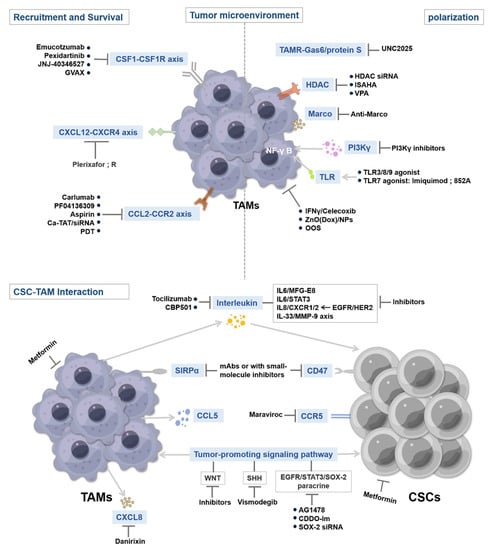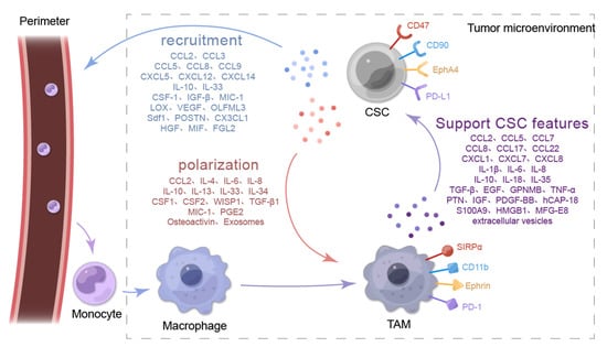 The functions of CSCs, such as immune escape, therapy resistance, metastasis, and maintenance of stemness, are largely dependent on the secretion of soluble factors (chemokines, interleukins, growth factors, or secreted proteins) and extracellular vesicles [33,34,35]. Specifically, CSCs signal by secreting soluble factors to recruit peripheral macrophages to the TME to become part of the tumor niche and by inducing macrophage transformation into TAMs [36]. A comprehensive understanding of the underlying mechanisms of macrophage recruitment and polarization by CSCs is beneficial for determining how to interrupt the mutual support pathway between CSCs and TAMs. Figure 1 presents the molecular interaction mechanisms between TAMs and CSCs.