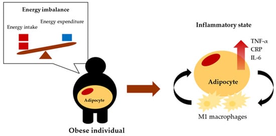 Obesity, which has been rising in prevalence worldwide over the past several decades, is now considered a public health epidemic. Obesity for adults is defined as a body mass index of ≥30 kg/m2 in Western populations, while the current Asia-Pacific guidelines recommend using a lower body mass index of ≥25 kg/m2 []. Obesity is linked to metabolic conditions such as hyperglycemia and dyslipidemia, which are well-known risk factors for developing chronic noncommunicable diseases, including hypertension, type II diabetes mellitus (T2DM), cancer, and cardiovascular disease (CVD) []. Individuals with obesity exhibit chronic low-grade systemic inflammation, which is characterized by increased secretion of pro-inflammatory cytokines from adipose tissue, made dysfunctional by the excessive accumulation of fat into the circulation; these cytokines include interleukin-6 (IL-6), C-reactive protein (CRP) and tumor necrosis factor-α (TNF-α) [].