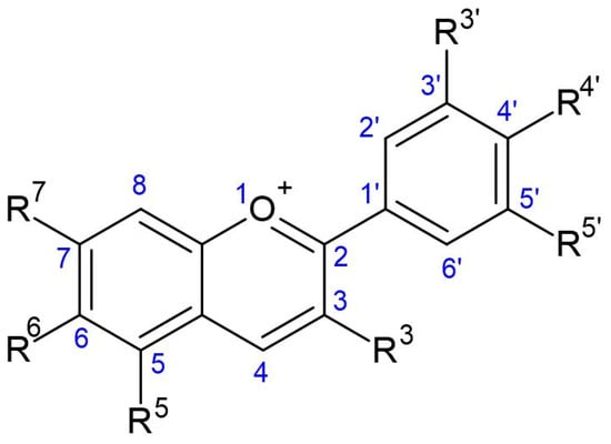 Fundamental structure of anthocyanin. (Drawn using the tool ACD/ChemSketch, version 2021.2.1, Advanced Chemistry Development, Inc., Toronto, ON, Canada).