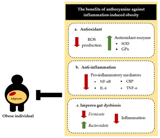 In patients with prolonged obesity, there may be a switch from the innate immune response to the adaptive immune response, leading to the onset of obesity-associated chronic diseases. Thus, obesity-related chronic diseases can be prevented or delayed by preventing long-term obesity []. Below we review the nutraceutical and pharmaceutical effects of anthocyanins that might be beneficial for treating obesity-related inflammation.