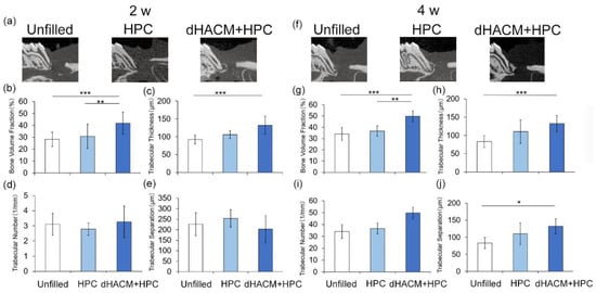 At 2 weeks, bone volume fractions were significantly greater in the dHACM+HPC group compared with that in the Unfilled (p < 0.001) and HPC group (p < 0.01) (Figure 1b). At 4 weeks, bone volume fractions were significantly greater in the dHACM+HPC group compared with that in the Unfilled and HPC group similar to the results of 2 weeks (Figure 1g). The trabecular thickness in the dHACM+HPC group at 2 weeks was significantly greater than that in the HPC group (p < 0.05) (Figure 1c). At 4 weeks, trabecular thickness in dHACM+HPC group was significantly greater than in the Unfilled group (p < 0.001) (Figure 1h). There were no significant changes in trabecular number at 2 and 4 weeks (Figure 1d,i). At 4 weeks, the trabecular separation was significantly smaller in the dHACM+HPC group compared with that in the Unfilled group (p < 0.05) (Figure 1j). It was suggested that dHACM promoted bone healing.
