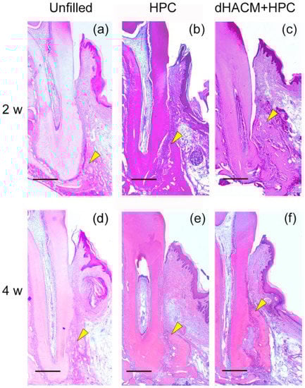 Histopathological overview (H-E staining). At 2 weeks, spaces in the defect are filled with newly formed connective tissue. (a,b) New bone formation is not observed in the Unfilled and HPC group. (c) In the dHACM+HPC group, newly formed bone can be observed from the tooth side of the intrabony defect. (d) At 4 weeks, new bone formation appeared minimal in the Unfilled group. (e) Newly formed bone was observed near the root side of the defect in the HPC group. (f) The extent of newly formed bone in the defect area in the dHACM + HPC group appeared to be greater than other groups. Yellow arrowheads indicate the coronal extent of newly formed bone. Original magnification ×25, bar = 500 µm.