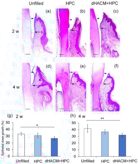 Histological assessment of epithelial down-growth. (a–f) The apical extent of epithelial down-growth (indicated by arrows) was compared at 2 and 4 weeks. Blue arrowheads indicate cemento-enamel junction (CEJ). (a,d) At 2 weeks, epithelial down-growth along the root surface in the dHACM+HPC group appears to be less than that in the Unfilled group (original magnification ×50; bar = 200 μm). (g,h) Data shown as mean ± SD (n = 6) of (the length between the most coronal and most apical aspects of the junctional epithelium on the root surface)/(the distance between CEJ and the bottom of the defect) (%) at 2 and 4 weeks. * p < 0.05, ** p < 0.01, by Kruskal–Wallis test with Dunn’s post hoc test.