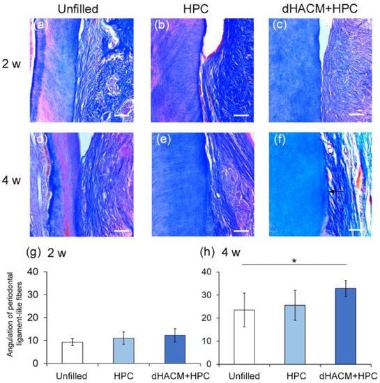 The healing of PDL was assessed by Azan–Mallory staining. Representative micrographs of Azan–Mallory staining of the areas near the defect bottom are shown in Figure 4a–f. PDL-like bundles in all groups were almost parallel to the root surfaces at 2 weeks, and cementum formation was not observed (Figure 4a–c). At 4 weeks, the PDL-like bundles ran obliquely in the dHACM+HPC group (Figure 4f). In the other groups, the ligaments ran near parallel to the root (Figure 4d,e). A thin layer of newly formed cementum-like structure was observed only in the dHACM + HPC group at 4 weeks. No significant difference in the mean angulation of the fiber bundles was observed at 2 weeks. The mean angulation in the dHACM + HPC group was significantly greater than that in Unfilled groups at 4 weeks. The application of dHACM promoted healing of PDL and, possibly, cementum.