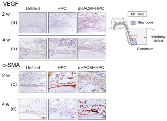 The effect of application of dHACM for periodontal defect on angiogenesis was evaluated by assessing the immunohistochemical staining for VEGF and α-SMA. VEGF-positive cells were often observed close to blood vessels in the connective tissue and around newly formed bone (Figure 5). At 2 weeks, a significantly greater proportion of VEGF-positive cells was observed in the dHACM+HPC group compared with the Unfilled group (Table 1). At 4 weeks, the proportion of VEGF-positive cells in the dHACM+HPC group was significantly greater than that in the HPC and Unfilled group (p < 0.05). At 4 weeks, the proportion of VEGF-positive cells in the dHACM+HPC group was significantly greater than that in the Unfilled group.