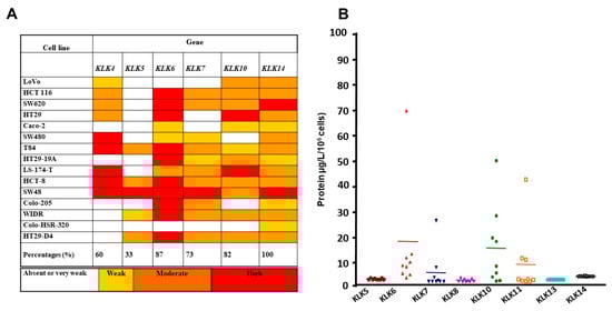 Figure 1. Analysis of the mRNA and protein expression pattern of KLK4, 5, 6, 7, and 14 in different colon cancer cell lines. (A) Analysis of KLK mRNA expression levels in the indicated human colon cancer cell lines by semiquantitative RT-PCR. (B) Secretion of KLK 4, 5, 6, 7, 8, 10, 13, and 14 in conditioned medium from nine colon cancer cell lines was assessed by ELISA and is presented in a scatter plot. The protein levels are shown as the mean concentration of KLKs (µg/L) secreted by 106 cells per 24 h. Median values are marked with a horizontal line.