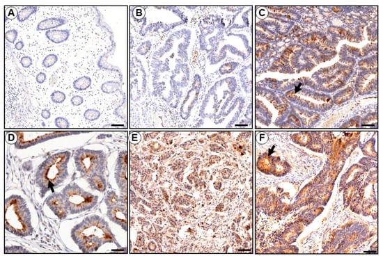 Figure 8. Representative immunostaining of the KLK6 in paraffin sections of colonic tissues from patients with adenocarcinoma. (A) KLK6 immunoreactivity is absent in ‘normal-appearing’ colonic mucosa very distant (more than 10 cm) from a colon adenocarcinoma (B) Immunostaining for KLK6 in the dysplastic colonic mucosa from the same patient as in (A) is seen. (CF) Moderate to strong positive immunoreactivity in the adenocarcinomas of four different patients. KLK6 immunoreactivity appeared to be distinguishable into a predominantly apical/cytoplasmic pattern (arrows). Bar = 100 µm (AF), 10 µm (D).