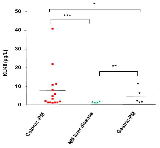 Figure 9. Immunodetection of KLK 6 in ascitic peritoneal metastasis from human colorectal cancer. Ascitic fluids were collected from peritoneal metastasis from human colorectal cancer (Colon-PM), (Gastric-PM) or from non-malignant liver diseases (NM Liver disease) and KLK6 expression was estimated by a sandwich-type ELISA (see Material and Methods). Protein values represent the mean concentration of KLK6 (µg/L). Data are shown as mean ± SEM. * p < 0.05; ** p < 0.01; *** p < 0.001.